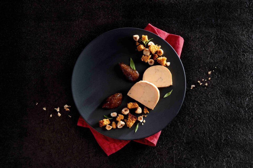 Disposer 2 tranches de Foie Gras sur un bord d’assiette.
