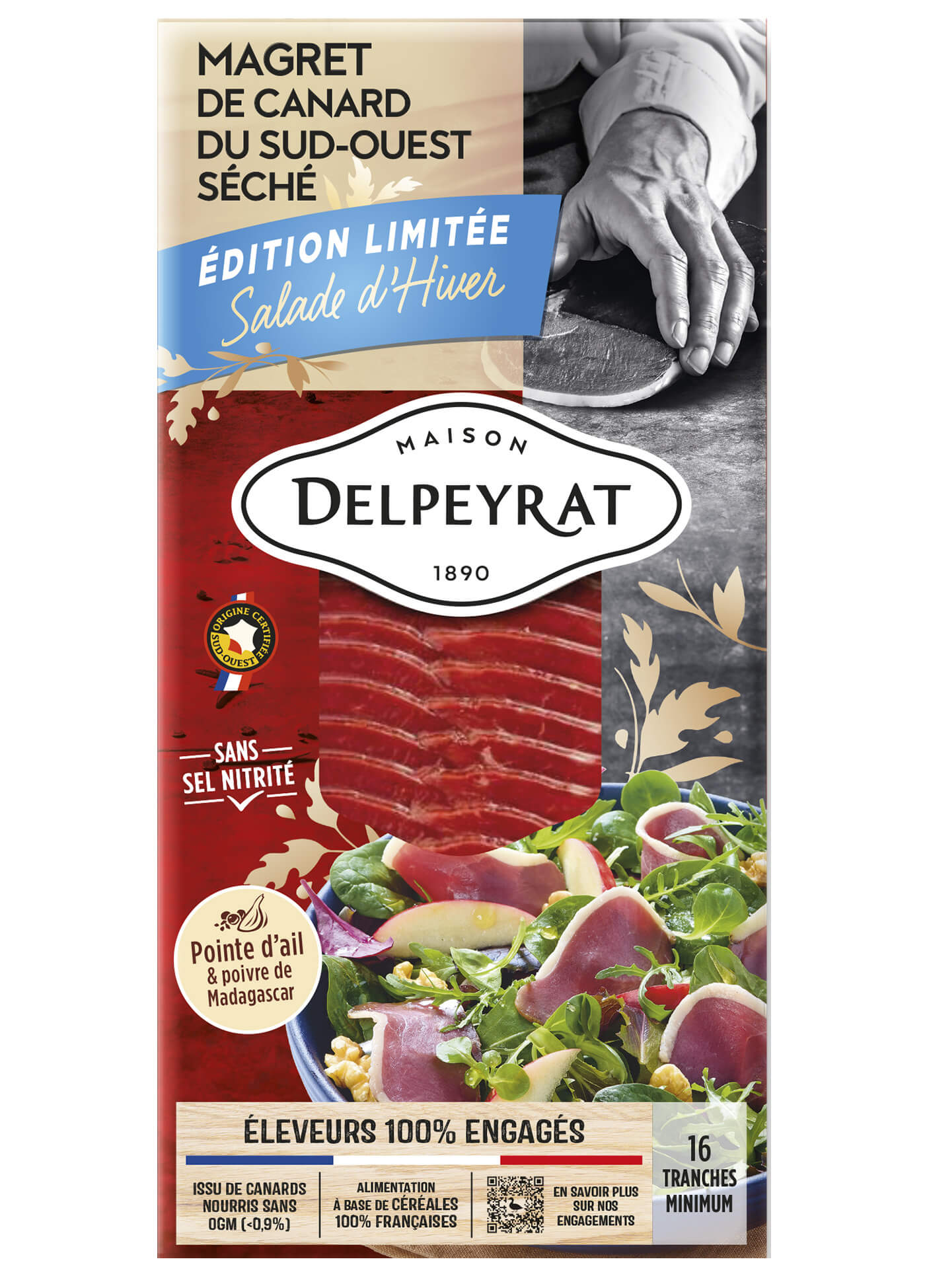 Ainsi, notre deuxième recette, mêlant ail et poivre de Madagascar, crée un équilibre raffiné entre puissance aromatique et douceur gustative, ce qui fait de ce magret séché l’atout idéal pour vos salades hivernales. Riche de son savoir-faire, Maison Delpeyrat sélectionne des ingrédients aux saveurs intenses et chaleureuses, pour créer une alliance unique avec le traditionnel magret de canard séché.